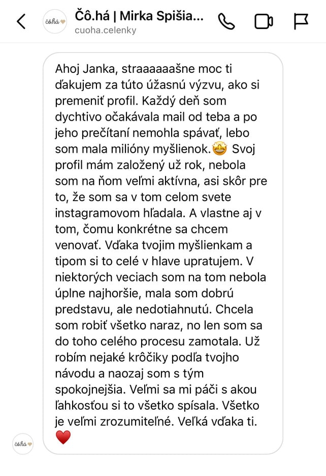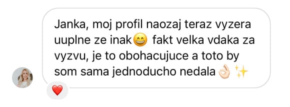 Ďakujem krásne za dôveru. Celý obsah výzvy som naplnila konkrétnymi príkladmi, vzormi a vysvetlením. Aby si vedela nielen logiku za tým, ako mať TIP TOP profil, ale aj aby si to zvládla sama. Ak však budeš mať nejakú otázku, prosím napíš mi na email, rada odpoviem a podporím ťa.
